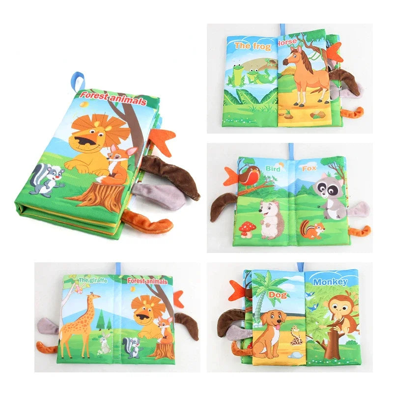 Interactive cloth book with sound paper and tail puzzles. Designed for infants to encourage early learning and parent-child interaction.